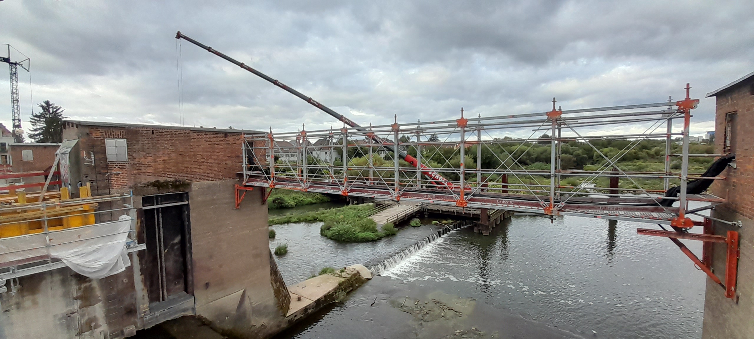 Unser Liebherr LTM 1230‑5.1 wurde auf einer Balkenkonstruktion positioniert – ein Arbeitsplatz, der praktisch mitten im Neckar schwebte.